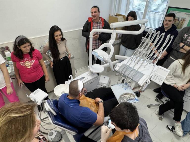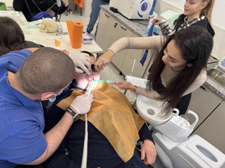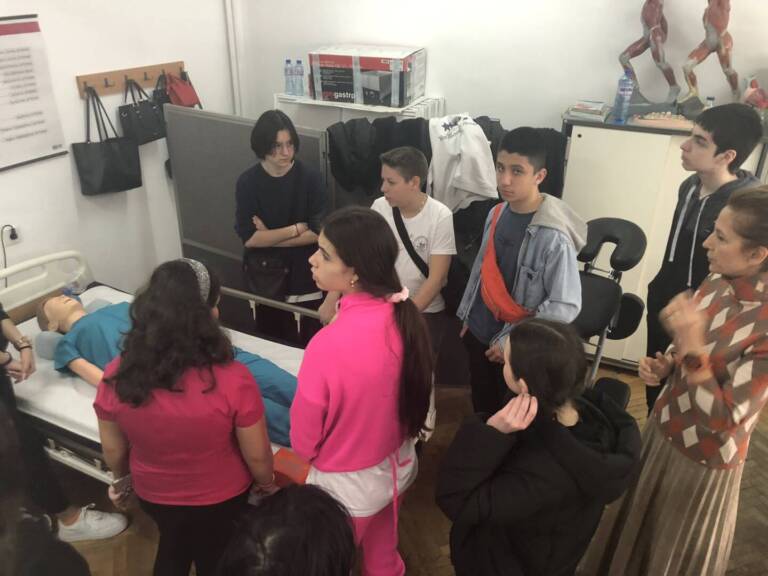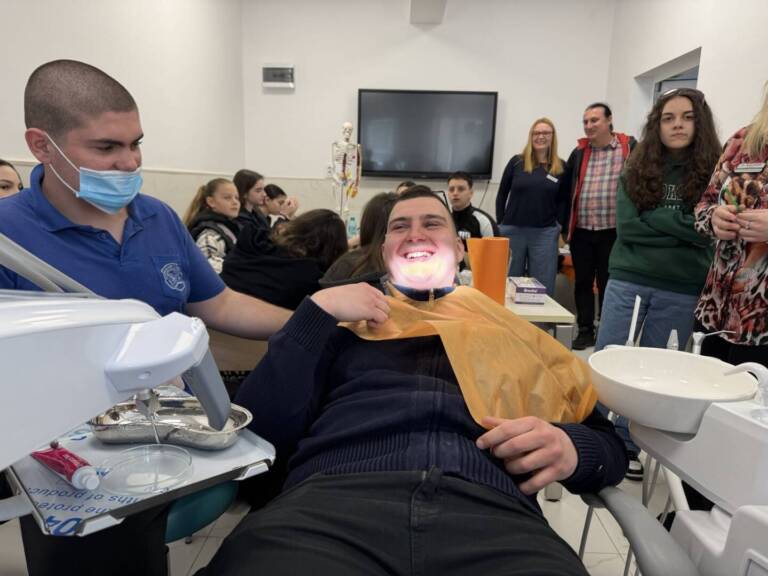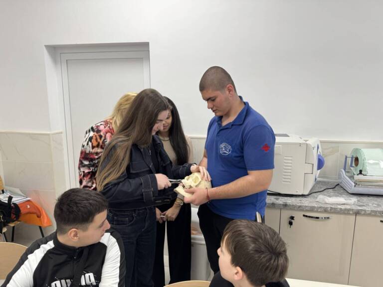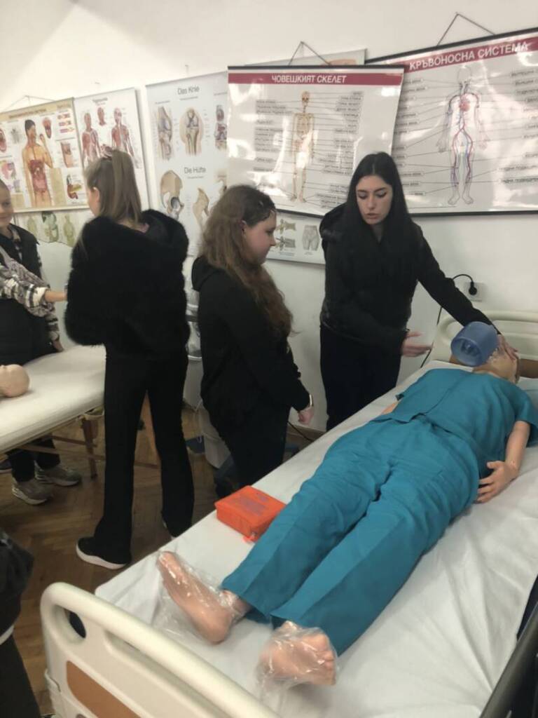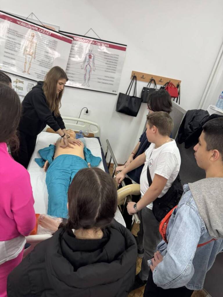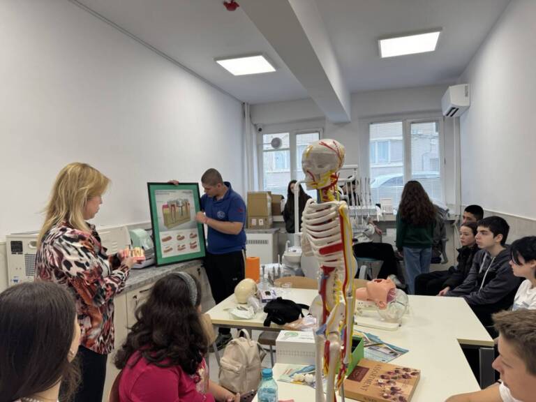 Събитието, организирано в изпълнение на Дейност 9.1 по Проект BG05SFPR001-3.001-0001 „Модернизиране на професионалното образование и обучение“, финансиран от Програма „Образование“ 2021 – 2027, съфинансиран от Европейския съюзсе се проведе на 25.03.2025 г. с начален час 10:00 ч. в специализираните кабинети по терапия и рехабилитация и дентални грижи с открити уроци по дисциплините: лечебен масаж, долекарска помощ и дентални болести и образна диагностика. Часовете по професионална подготовка бяха посетени от ученици от VI и VII клас на ОУ „Христо Ботев“, кв. Сарафово, придружавани от г-н Радослав Жеков. По време на откритите уроци учениците, на които предстои кандидатстване и избор в VIII клас имаха възможността да се запознаят с двете специалности, изучавани в СУ „Иван Вазов“, Бургас: „Извършване на термални процедури в балнеологични и други възстановителни центрове“ и „Асистент на лекар по дентална медицина“ с цел популяризиране на професионалното образование. В часът по дентални болести, който се проведе в училищния стоматологичен кабинет, д-р Вишиванюк със своя екип от млади асистенти акцентираха на грижата за устната кухина и демонстрираха на практика част от работата на денталния асистент. По време на откритият урок по лечебен масаж, воден от рехабилитатора г-жа Янкова, изпълнителите на термални процедури запознаха гостите с основните изисквания за провеждане на масаж и презентираха работа със специализирана медицинска апаратура и масаж на гръб. В последният от часовете по професионална подготовка г-жа Илиева, медицинска сестра и нашите ученици показаха как се спасява човешки живот, спазвайки алгоритъм ABCD за спасяване на пострадал и демонстрираха върху медицински анатомичен модел на човек как се прави сърдечен масаж, а специализиран софтуер отчиташе правилното изпълнение на животоспасяващата задача.