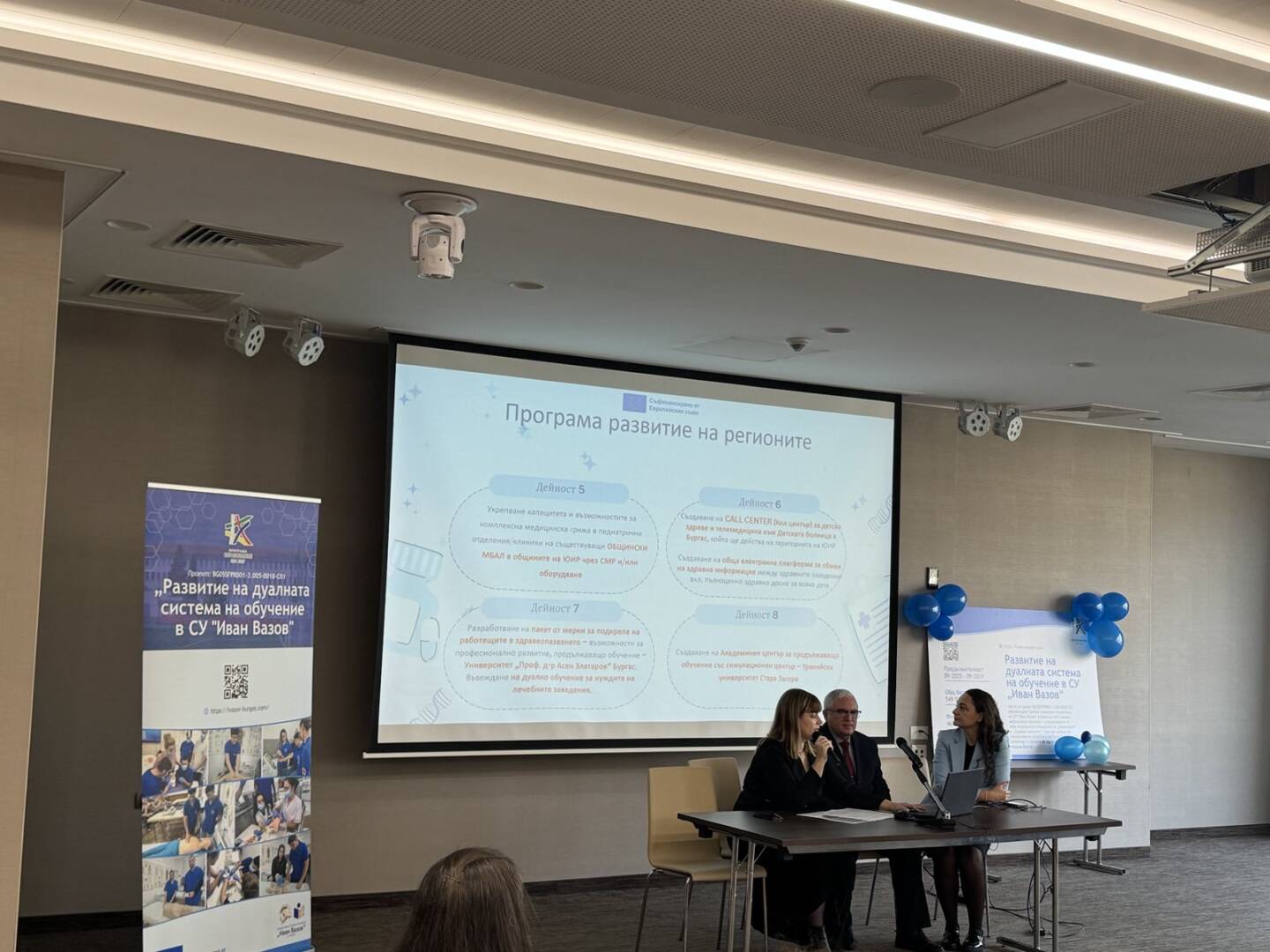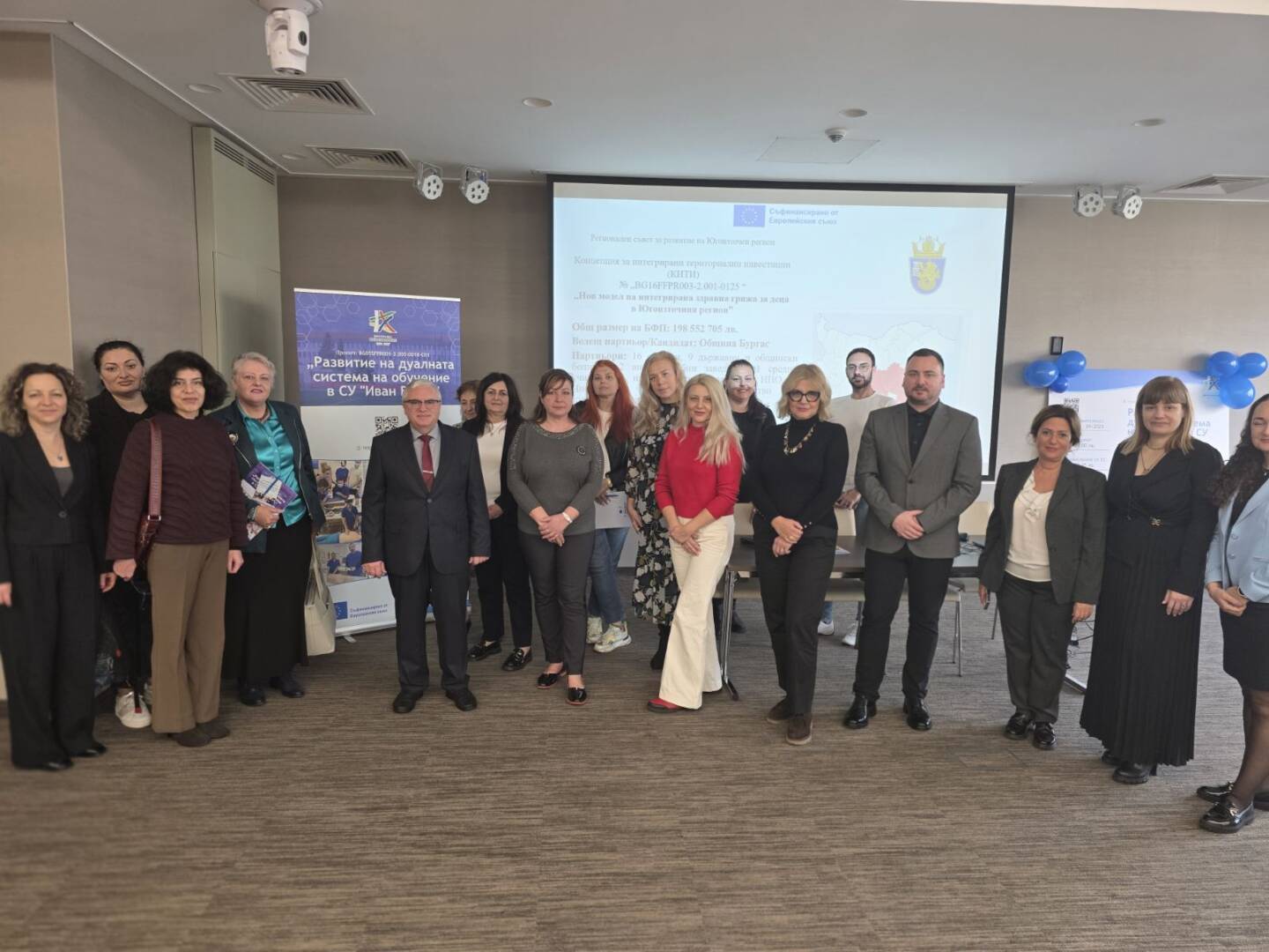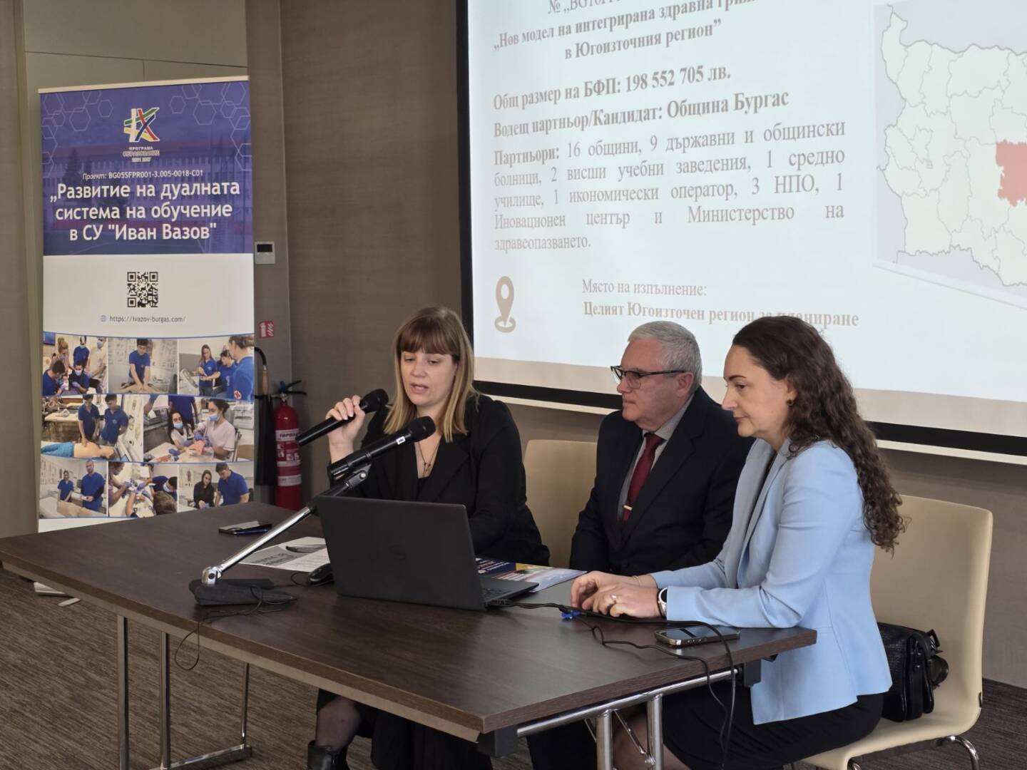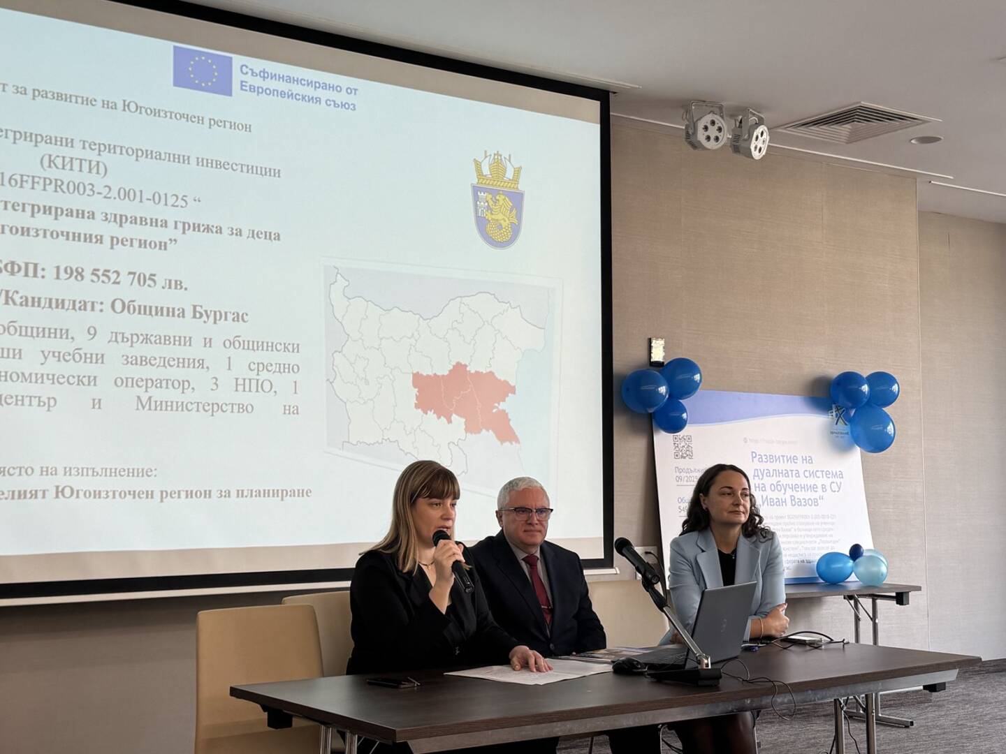 СУ „Иван Вазов“, Бургас официално отбеляза стартирането на Проект № BG05SFPR001-3.005-0018-C01 Развитие на дуалната система на обучение в СУ „Иван Вазов“ в подкрепа изграждането на нов модел на здравни грижи за деца в ЮИР, финансиран по процедура BG05SFPR001-3.005 Развитие на дуалната система на обучение в ПОО (чрез прилагане на подхода ИТИ), Програма „Образование“ 2021-2027 с пресконференция, която се проведе на 20.11 2025 г. в конферентната зала на Интерхотел „България“. Екипа по проекта с ръководител директора на СУ „Иван Вазов“, Бургас г-н Виктор Григоров и неговия екип: г-жа Галина Вълкова- ЗДУД, г-жа Валентина Тодорова и г-жа Лиляна Христова запозна представителите на работодателите, браншови и професионални организации на медицинските и дентални специалисти, представители на Община Бургас и колеги от професионални гимназии с разширяване на възможностите за качествено провеждане на дуалната форма на обучение и преодоляване недостига на професионалисти, работещи в сферата на здравеопазването, като част от мерките предвидени за реализиране на нов модел на здравна грижа за децата в ЮИР. Информационната кампания запозна обществеността с основните цели на проекта, партньорите, при които учениците от двете специалности „асистент на лекар по дентална медицина“ и „изпълнител на термални процедури в балнеологични и други възстановителни центрове“ и представи добри национални и международни практики при провеждането на дуално ПОО.