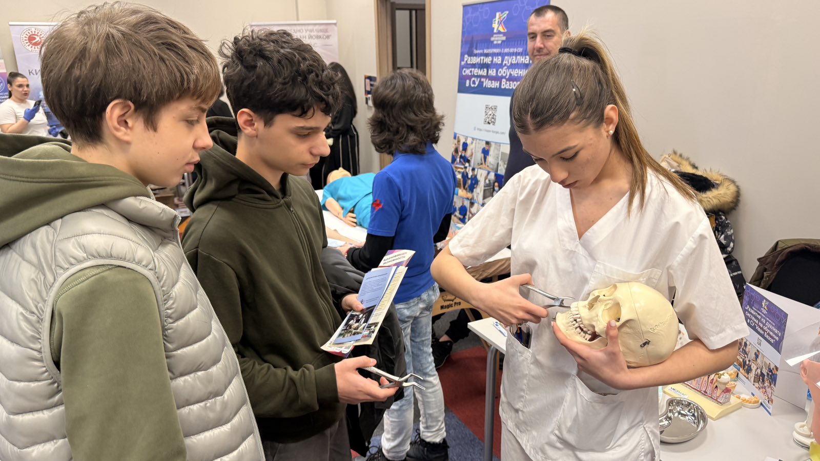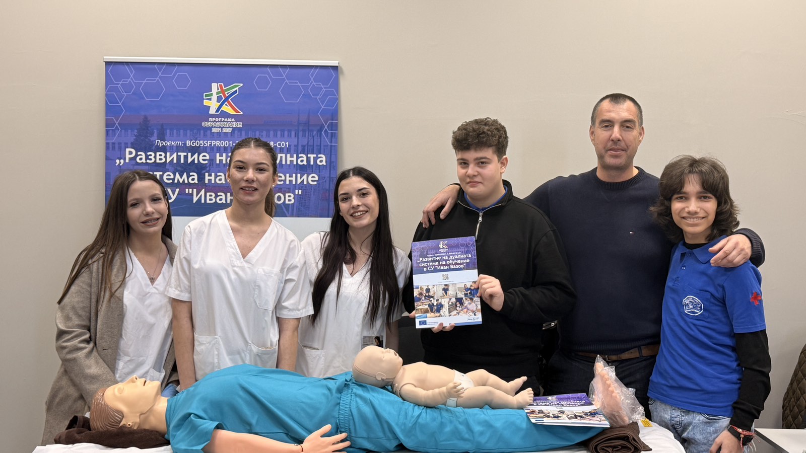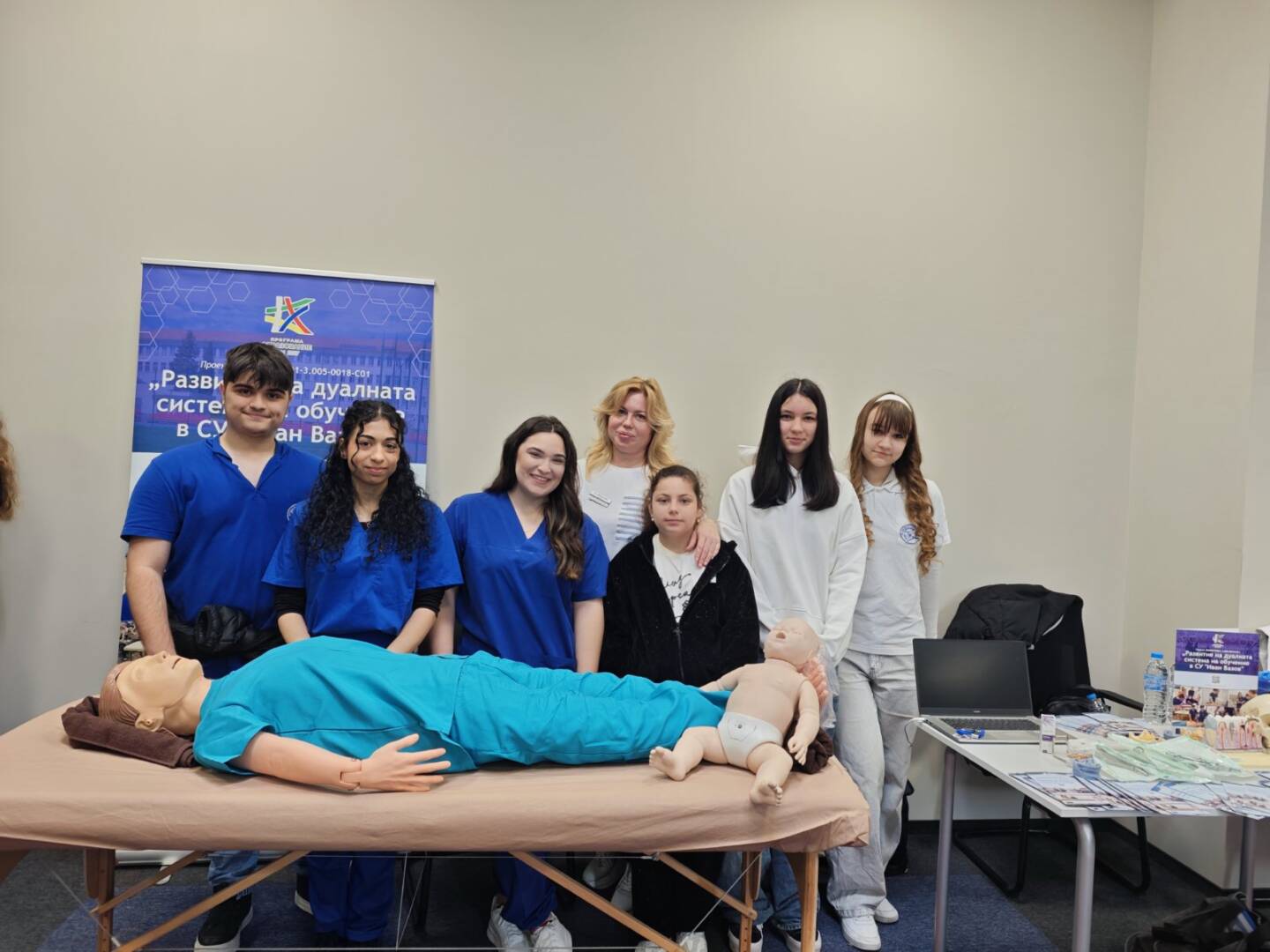 На 14.03.2026 г. ученици от СУ „Иван Вазов“, Бургас активно се включиха в образователния форум “Избирам да уча в България” в Бургас, организиран с подкрепата на Община Бургас. Бъдещите медицински специалисти представиха двете изучавани в училището специалности в дуална форма на обучение: „Асистент на лекар по дентална медицина“ и „Изпълнител на термални процедури в балнеологични и други възстановителни центрове“. По време на форума бе проведена информационна кампания сред родители, ученици и широката общественост с цел повишаване привлекателността на дуалната система на обучение и подпомагане процеса на мотивиране и насочване за включване в дуално ПОО. Кампанията бе част от Дейност 4, Поддейност 2: Провеждане на информационни кампании сред родители, ученици и широката общественост по проект № BG05SFPR001-3.005-0018-C01 Развитие на дуалната система на обучение в СУ „Иван Вазов“ в подкрепа изграждането на нов модел на здравни грижи за деца в ЮИР, финансиран по процедура BG05SFPR001-3.005 Развитие на дуалната система на обучение в ПОО (чрез прилагане на подхода ИТИ), Програма „Образование“ 2021-2027.